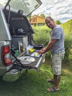 Links auf dem Bild seht Ihr die bisherige Lösung am alten D22 PickUp. Da diente die Heckklappe als Küche und Arbeitsfläche in einem.
